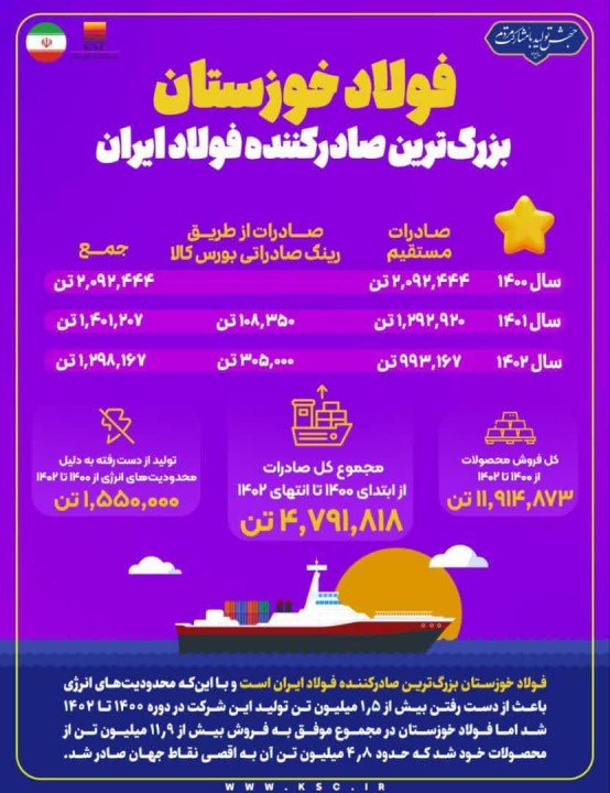 شرکت فولاد خوزستان بزرگترین صادرکننده فولاد ایران و مطرحترین برند ایرانی در بازار جهانی فولاد است و با اینکه محدودیتهای انرژی باعث از دست رفتن بیش از 1.5 میلیون تن تولید این شرکت در دوره سهساله 1400 تا 1402 شد اما فولاد خوزستان در مجموع در این دوره، موفق به فروش بیش از 11.9 میلیون تن از محصولات خود شد که حدود 4.8 میلیون تن آن به اقصی نقاط جهان صادر شد.