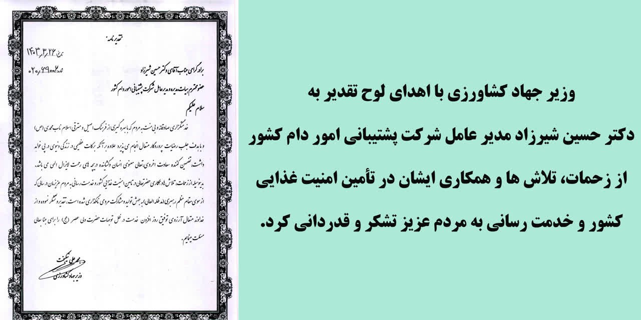 وزیر جهاد کشاورزی با اهدای لوح تقدیر به دکتر حسین شیرزاد مدیر عامل شرکت پشتیبانی امور دام کشور از زحمات، تلاش ها و همکاری ایشان در تأمین امنیت غذایی کشور و خدمت رسانی به مردم عزیز تشکر و قدردانی کرد.