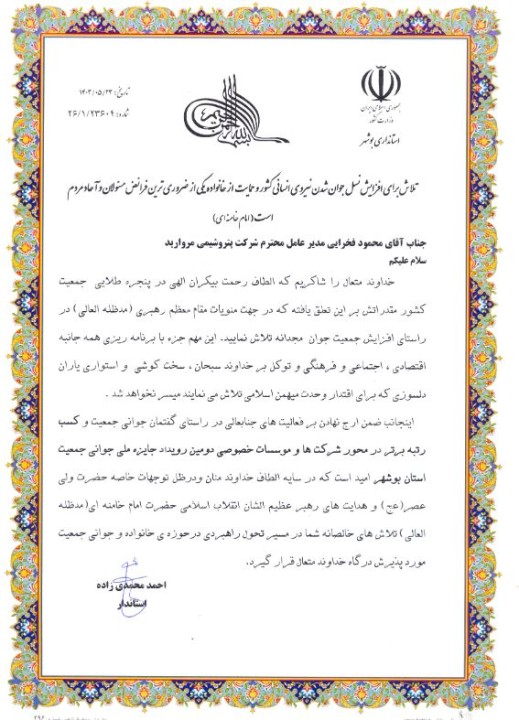 تجلیل از شرکت پتروشیمی مروارید به عنوان رتبه برتر در محور شرکت‌ها و موسسات خصوصی دومین رویداد استانی جایزه جوانی جمعیت