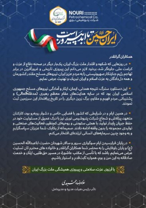 دکتر غلامرضا جمشیدی مدیرعامل شرکت پتروشیمی نوری در پیامی پیروزی بزرگ ملت ایران و حماسه پرافتخار نیروهای مسلح کشور را در دفاع از میهن عزیز و اسلامی ایران تبریک گفت.