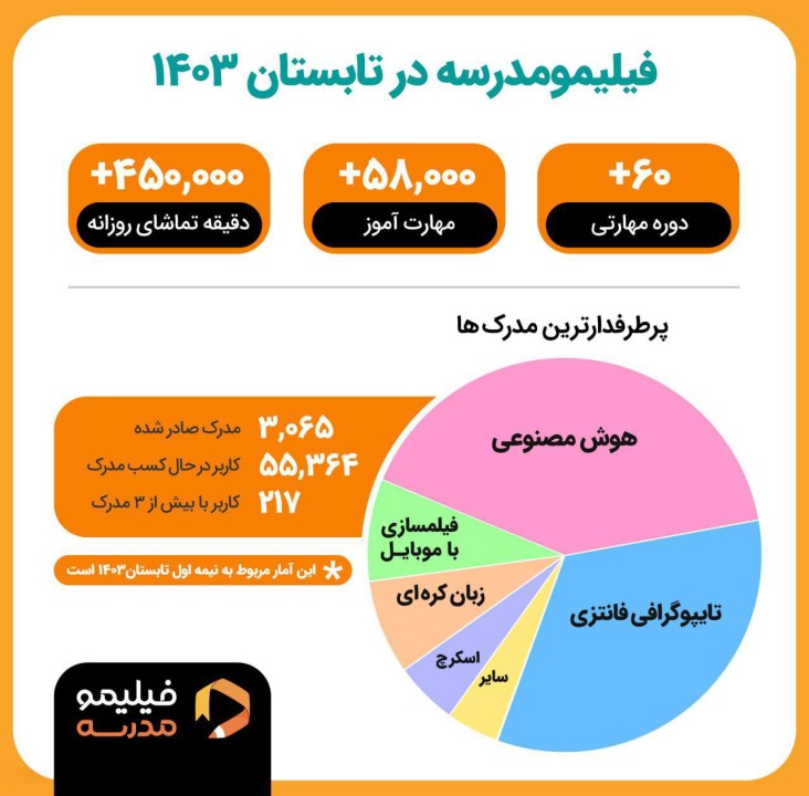 به گزارش روابط گستر، تا نیمه تابستان 1403 کاربران «فیلیمومدرسه» روزانه به طور متوسط 450 هزار دقیقه توسط ویدئوی آموزشی مشاهده کردند؛ ویدئوهایی از بیش از 60 دوره مهارتی و تکنیکی جذاب برای روزهای گرم تابستانی دانشآموزان طراحی و تولید شده بود.