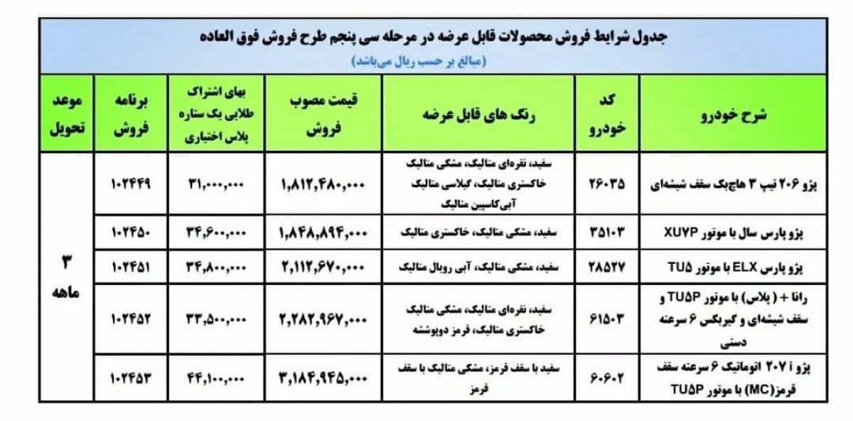 بر اساس این گزارش، در این دو طرح فروش، دو محصول جدید 207 اتوماتیک مجهز به گیربکس شش سرعته با رنگ قرمز و 206 تیپ سه با سقف شیشهای، در کنار پژو پارس سال مجهز به موتور XU7P، پارس ELX با موتور TU5 و راناپلاس با موتور TU5 پلاس و سقف شیشهای و مجهز به گیربکس شش سرعته دستی عرضه شده است.