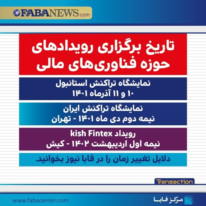 اکوسیستم صنایع‌ مالی، بانکی، پرداخت و فناوری منتظر برگزاری سه رویداد بزرگ حوزه فناوری‌های مالی هستند که عبارتند از: نمایشگاه تراکنش استانبول، هشتمین نمایشگاه تراکنش ایران و رویداد Kish fintex که پیش از این زمان آن ها در مهرماه، آذرماه و بهمن ماه ۱۴۰۱ وعده داده شده بود.