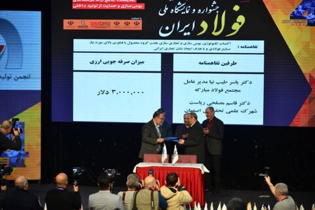 در چهارمین جشنواره و نمایشگاه ملی فولاد ایران، در راستای تحقق شعار سال 1401 مبنی بر تولید دانشبنیان و اشتغالآفرین برای بهرهمندی از توان بالقوه و بالفعل شرکتهای دانشبنیان عضو شهرک علمی تحقیقاتی اصفهان و بهمنظور توسعه همهجانبه بومیسازی اقلام مورد نیاز صنعت فولاد با هدف تکمیل سبد محصولات در شرکتهای مورد اشاره، تفاهمنامهای بین شرکت فولاد مبارکه اصفهان به نمایندگی محمدیاسر طیبنیا و شهرک علمی تحقیقاتی اصفهان به نمایندگی قاسم مصلحی منعقد شد که محمد ناظمی هرندی، معاون تکنولوژی فولاد مبارکه نیز به نمایندگی از مدیرعامل این شرکت این تفاهمنامه را امضا کرد تا با اجرای آن در آیندهای نزدیک، صرفهجویی ارزی 3 میلیون دلاری حاصل شود.