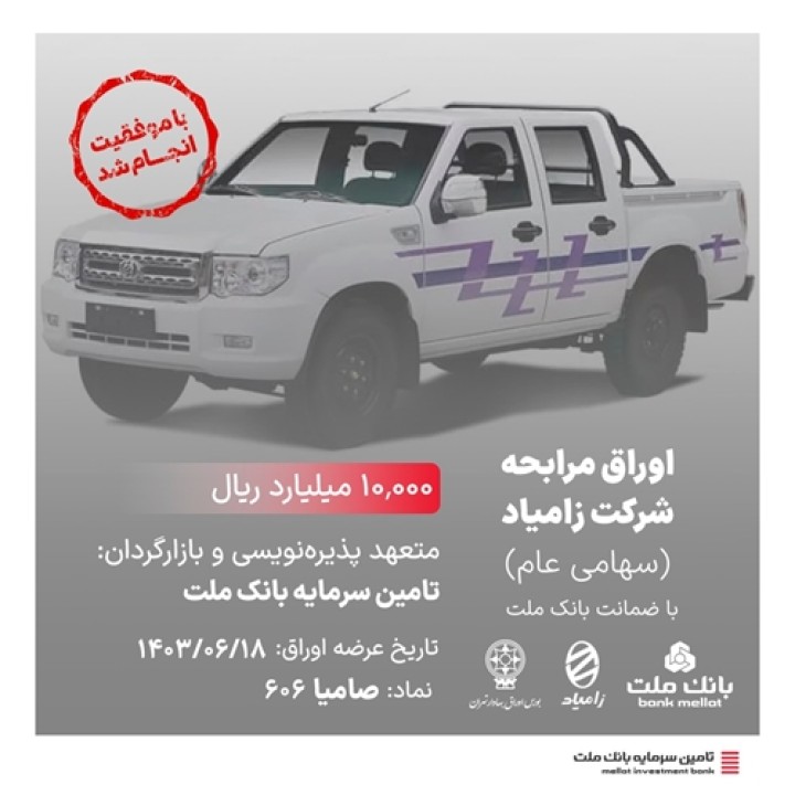 انتشار 10,000 میلیارد ریال اوراق صکوک مرابحه برای تامین مالی شرکت زامیاد روز یکشنبه ۱۸ شهریورماه با تعهد پذیرهنویسی و بازارگردانی تامین سرمایه بانک ملت صورت گرفت و با موفقیت به پایان رسید.
