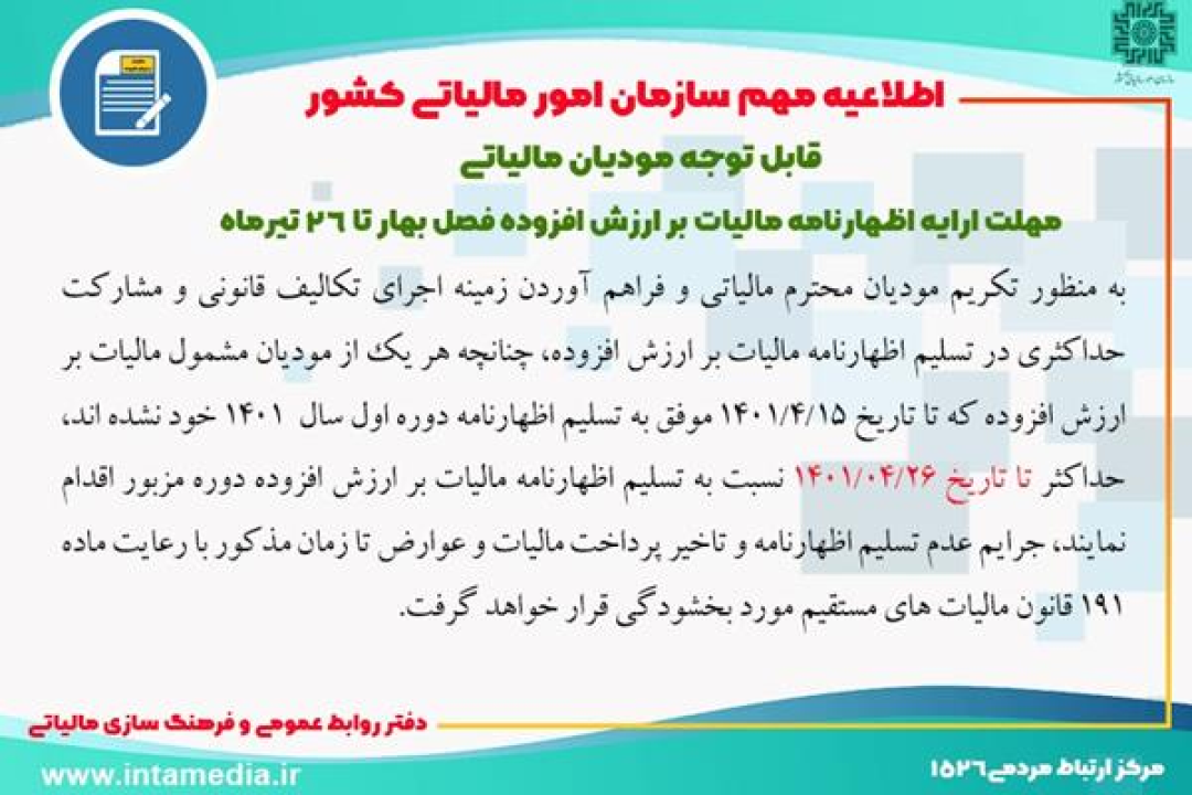 چنانچه هر یک از مودیان مشمول مالیات بر ارزش افزوده که تا تاریخ 1401/4/15 موفق به تسلیم اظهارنامه دوره اول سال  1401 خود نشده اند، حداکثر تا تاریخ 1401/04/26 نسبت به تسلیم اظهارنامه مالیات بر ارزش افزوده دوره مزبور اقدام نمایند، جرایم عدم تسلیم اظهارنامه و تاخیر پرداخت مالیات و عوارض تا زمان مذکور با رعایت ماده 191 قانون مالیات های مستقیم مورد بخشودگی قرار خواهد گرفت.