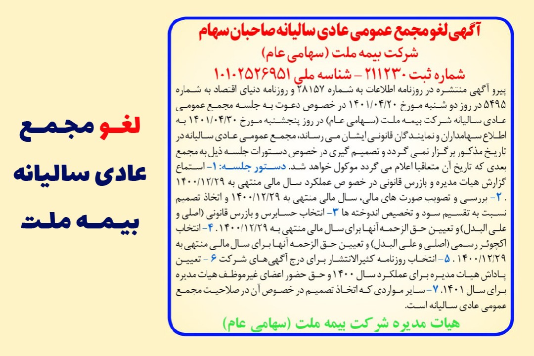 پیرو آگهی منتشره در روزنامه اطلاعات به شماره 28157 و روزنامه دنیای اقتصاد به شماره 5495 در روز دوشنبه 20 تیر 1401 در خصوص دعوت به جلسه مجمع عمومی عادی سالیانه شرکت بیمه ملت (سهامی عام) در روز پنج شنبه 30 تیر1401 به اطلاع سهام داران و نمایندگان قانونی ایشان می رساند، مجمع عادی سالیانه در تاریخ مذکور برگزار نمی شود و تصمیم گیری در خصوص دستورات جلسه ذیل به مجمع بعدی که تاریخ آن متعاقبا اعلام می شود، موکول خواهد شد.