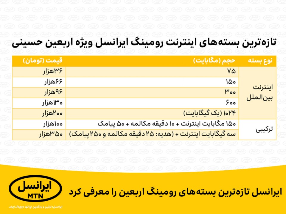 بستههای اینترنت رومینگ، ویژه ایام اربعین، از طریق کد دستوری #41111 و نیز سوپر اپلیکیشن ایرانسلمن، قابل فعالسازی هستند.