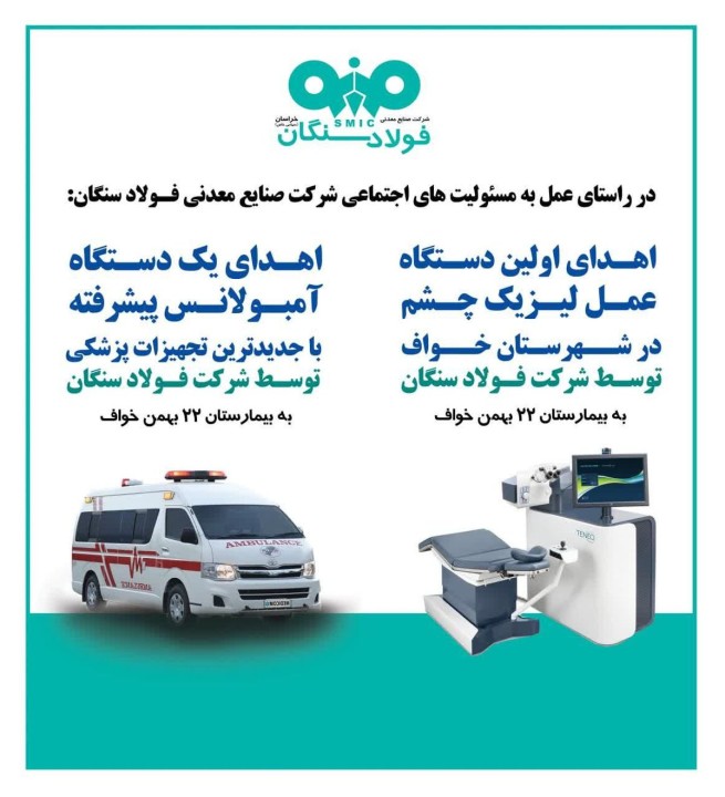 شرکت صنایع معدنی فولاد سنگان در راستای عمل به مسئولیت های اجتماعی در شهرستان خواف و با هدف توسعه خدمات بهداشتی و درمانی و همزمان با سالروز تولد حضرت زینب (س) و گرامیداشت روز پرستار، اقدام به اهدای یک دستگاه آمبولانس پیشرفته با جدیدترین و بروزترین تجهیزات پزشکی به بیمارستان ۲۲ بهمن شهرستان خواف نمود.