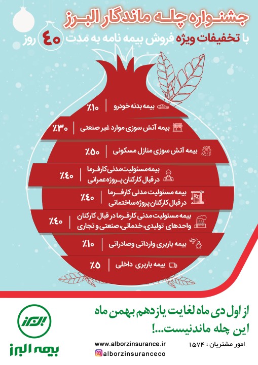 بر این اساس، تمامی بیمه گزارانی که از تاریخ اول دی تا 11 بهمن به مدت 40 روز به خرید بیمه نامه های مذکور از شرکت بیمه البرز اقدام کنند مشمول استفاده از تخفیف های بیمه ای جشنواره " چله ماندگار البرز" هستند.