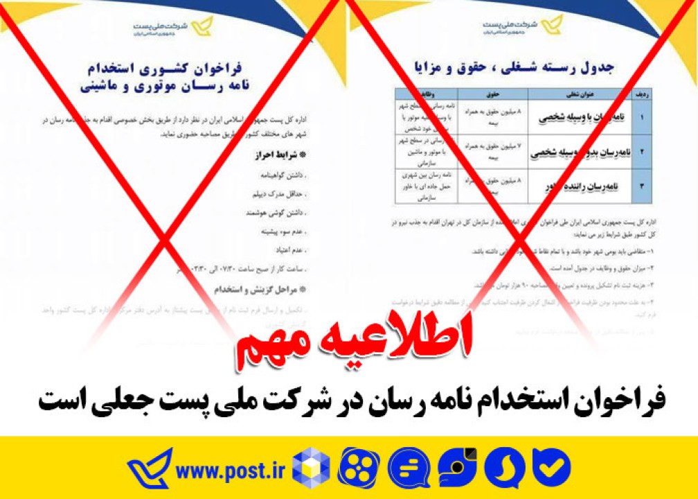 این شرکت با اعلام اینکه در حال پیگیری قانونی از مبادی ذیربط است، اعلام می دارد هرگونه فراخوان صرفا از طریق تارنمای شرکت ملی پست به نشانی post.ir منتشر می شود و هر شکل دیگری از اطلاع رسانی فاقد ارزش است.