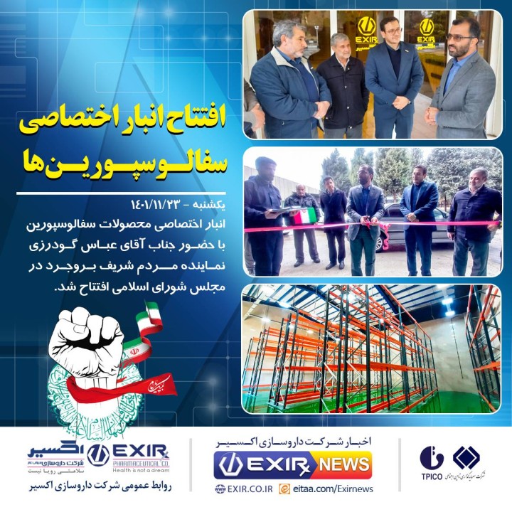 انبار اختصاصی محصولات سفالوسپورین ها به مساحت ۳۱۵ متر مربع در کارخانجات داروسازی اکسیر افتتاح شد