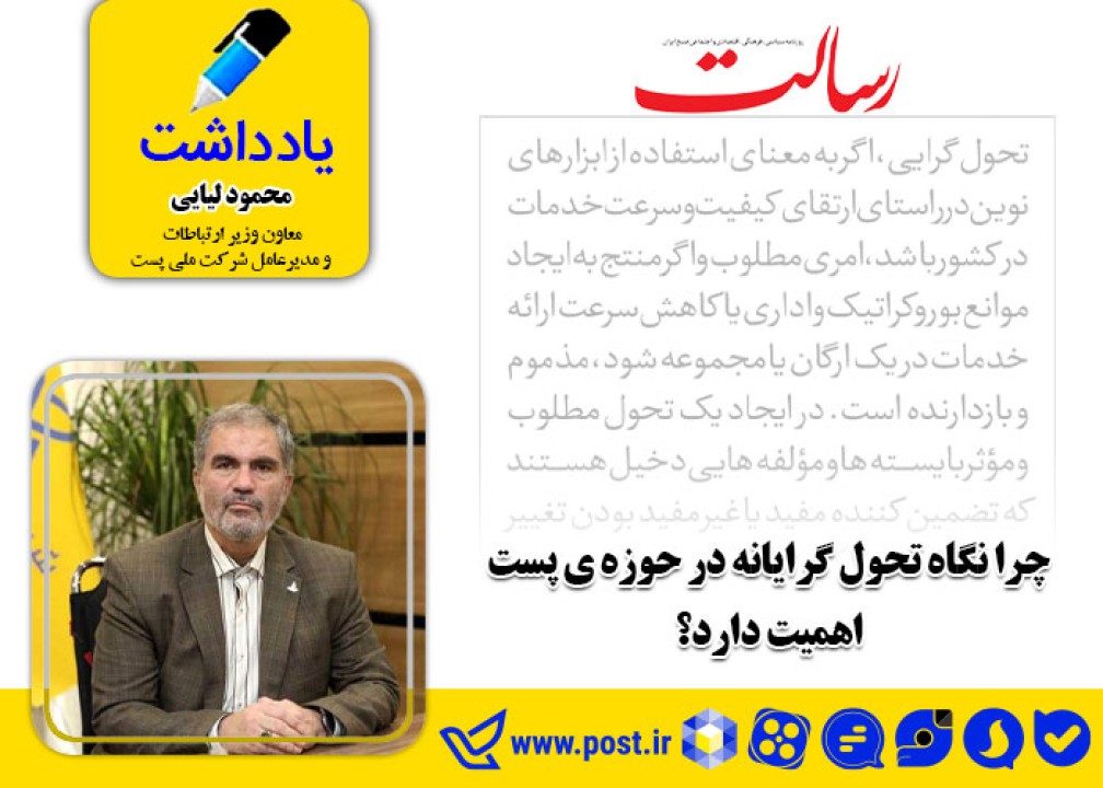 به گزارش دفتر ارتباطات و اموربین الملل شرکت ملی پست، محمود لیایی در یادداشتی که در روزنامه رسالت منتشر شده به نگاه تحول گرایانه در شرکت ملی پست پرداخته است که متن آن را ادامه می خوانید.