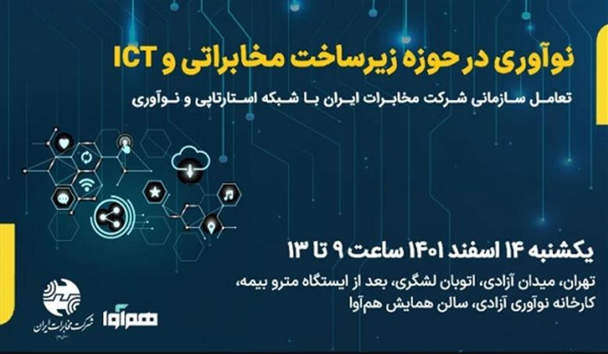 همایش نوآوری در حوزه زیرساخت مخابراتی و آی سی تی با هدف افزایش تعامل سازمانی شرکت مخابرات ایران با شبکه استارتاپی و نوآوری کشور، یکشنبه ۱۴ اسفندماه ۱۴۰۱ در سالن همایش هم آوا برگزار می شود