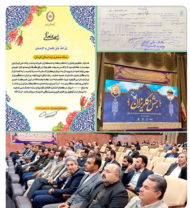 به گزارش روابط عمومی بانک ملی ایران، در جشن گلریزانی که با حضور حجت الاسلام والمسلمین علیدادی سلیمانی نماینده ولی فقیه و امام جمعه کرمان ، دکتر پورابراهیمی نماینده مردم کرمان در مجلس شورای اسلامی ، دکتر فداکار استاندار و جمعی از مسئولان استانی برگزار شد کمک های نقدی همکاران به ستاد دیه استان اهدا شد.
