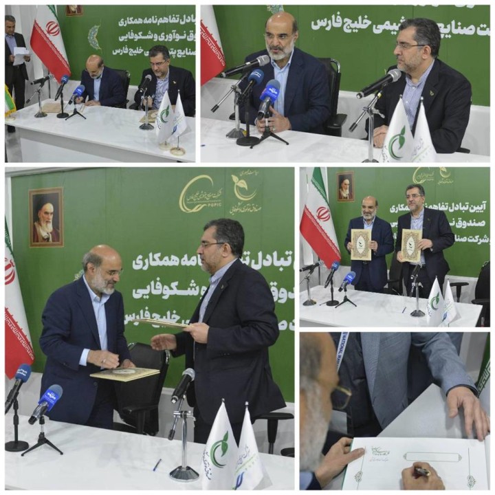 تفاهمنامه همکاری برای توسعه فعالیتهای دانشبنیان در زنجیره ارزش پتروشیمی میان هلدینگ خلیج فارس و صندوق نوآوری و شکوفایی در روز پایانی بیست و هفتمین نمایشگاه نفت، گاز، پالایش و پتروشیمی میان دکتر علی عسکری مدیرعامل هلدینگ خلیج فارس و محمدصادق خیاطیان، رییس هیئت عامل صندوق نوآوری و شکوفایی ریاست جمهوری به امضا رسید.