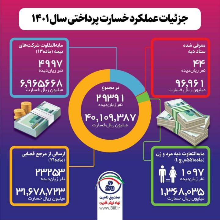 اين گزارش حاكي است: از این مقدار،  23.252 نفر زیان‌دیده مبلغ 31.678.723 ميليون ریال بابت پرونده های ارسالی از مراجع قضایی و 4.997 نفر معادل 6.965.668 ميليون ریال بابت ما به التفاوت شرکت های بیمه (ماده 13) خسارت دريافت كرده‌اند. هم‌چنين صندوق تامین خسارت‌های بدنی در دوره يادشده،  به 1097 نفر زیاندیده معادل 1.368.035 ميليون ریال بابت مابه التفاوت دیه زن و مرد ( ماده 551) خسارت پرداخته است. ضمن اين‌كه 44 نفر زیان‌دیده هم در مجموع 96.961 ميليون ریال بابت پرونده های معرفی شده ستاد دیه، خسارت دریافت کرده‌اند.