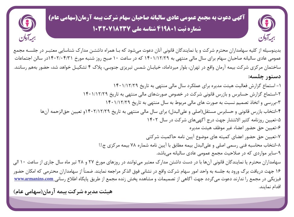 سهامداران محترم یا نمایندگان قانونی آنها با در دست داشتن مدارک معتبر می توانند در روزهای مورخ 27 و 28 تیر ماه سال جاری از ساعت 10 الی16 جهت دریافت برگ ورود به جلسه به واحد امور سهام شرکت واقع در نشانی فوق الذکر مراجعه نمایند. ضمناً از سهامداران محترمی که امکان حضور فیزیکی در مجمع را ندارند دعوت می گردد جهت آگاهی از تصمیمات و مشاهده پخش زنده مجمع از طریق پایگاه اطلاع رسانی www.armanins.com اقدام نمایند.