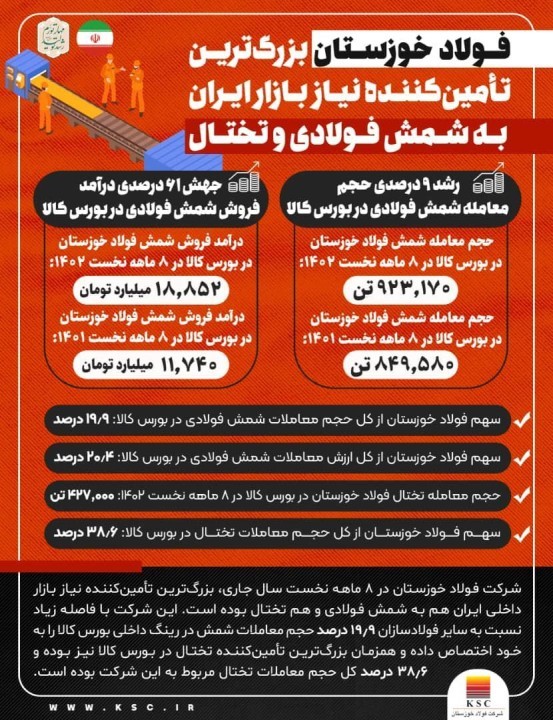 شرکت فولاد خوزستان در 8 ماهه نخست سال جاری، بزرگترین تامینکننده نیاز بازار داخلی ایران هم به شمش فولادی و هم تختال بوده است. این شرکت با فاصله زیاد نسبت به سایر فولادسازان 19.9 درصد حجم معاملات شمش در رینگ داخلی بورس کالا را به خود اختصاص داده و همزمان بزرگترین تأمینکننده تختال در بورس کالا نیز بوده و 38.6 درصد کل حجم معاملات تختال مربوط به این شرکت بوده است.