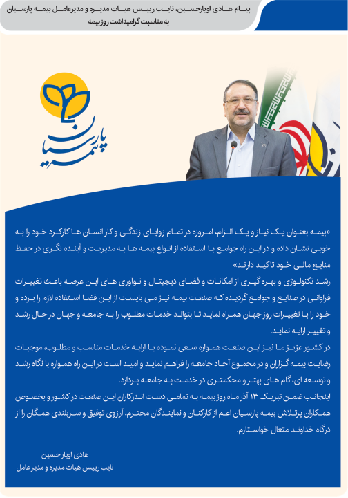 اینجانب ضمن تبریک 13 آذر ماه روز بیمه به تمامی دست اندرکاران این صنعت در کشور و بخصوص همکاران پرتلاش بیمه پارسیان اعم از کارکنان و نمایندگان محترم، آرزوی توفیق و سربلندی همگان را از درگاه خداوند متعال خواستارم.