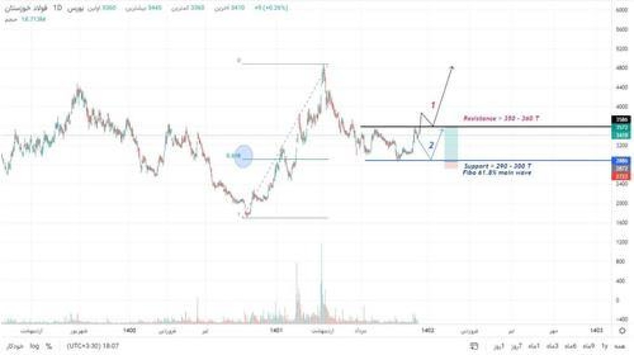 2) صبر و شکار سهم در منطقه حمایتی 290 – 300 تومان با ریسک به ریوارد 4٫6 ( نقطه ورود 290 تومان ، حد ضرر 275 تومان و حد سود 360 تومان )