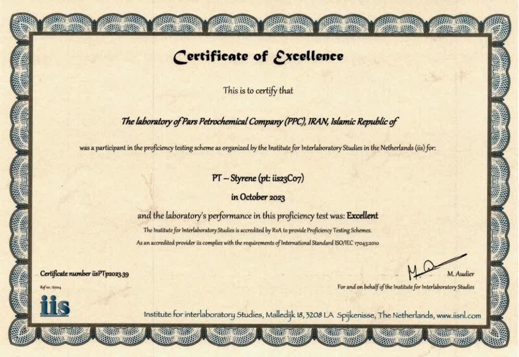 آزمایشگاه شرکت پتروشیمی پارس برای هشتمین مرتبه متوالی، در آزمون مهارت بینالمللی نمونه استایرن توسط پتروشیمی پارس مؤسسه iis هلند رتبه عالی را کسب کرد.