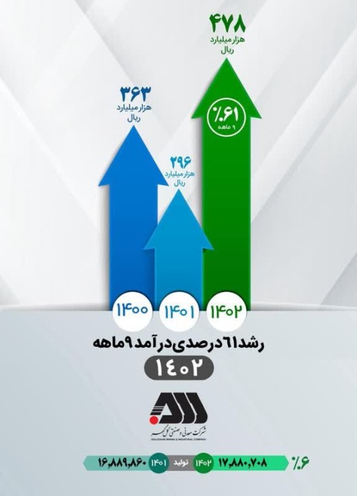 درآمد عملیاتی شرکت معدنی و صنعتی گلگهر (نماد: کگل) در دوره ٩ ماهه ابتدایی سال ۱۴۰۲ با ۶۱ درصد افزایش نسبت به دوره مشابه سال قبل به ۴۷۸ هزار میلیارد ریال رسید.
