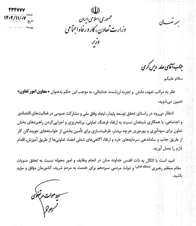 سید صولت مرتضوی، وزیر تعاون کارورفاه اجتماعی با صدور حکمی حامد ویس کرمی از مدیران شایسته وزارت تعاون، کار و رفاه اجتماعی را به عنوان معاون امور تعاون این وزارتخانه منصوب کرد.
