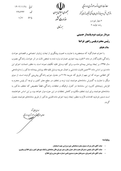 معاون عمران، توسعه شهری و روستایی وزیر کشور در نامه ای به رئیس پلیس راهور فراجا، خواستار اعمال هوشمند جریمه وسایل نقلیه فاقد بیمه نامه شخص ثالث و تخصیص کد تخلف در فهرست جرایم رانندگی شد.