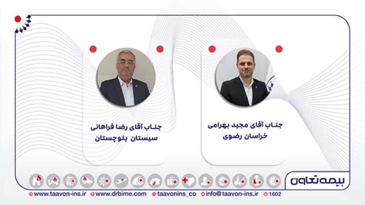دو رئیس شعبه بیمه تعاون جناب آقایان بهرامی و فراهانی به ترتیب در استانهای خراسان رضوی و سیستان و بلوچستان به عنوان دبیر شورای هماهنگی شرکتهای بیمه در استانهای کشور انتخاب شدند