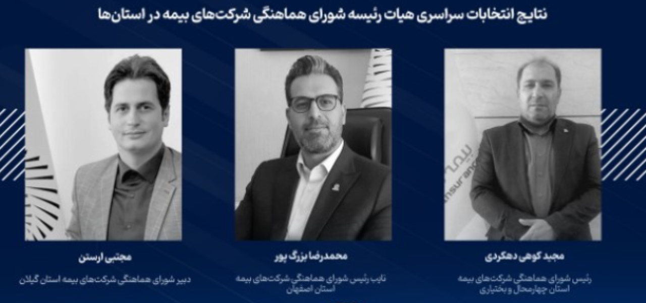 مجید کوهی فایق دهکردی مدیر شعبه مرکزی استان چهارمحال بختیاری به عنوان رئیس، محمدرضا بزرگ پور مدیر شعبه مرکزی استان اصفهان به عنوان نایب رئیس و مجتبی ارستن مدیر شعبه مرکزی استان گیلان به عنوان دبیر شورای هماهنگی شرکتهای بیمه استان خود انتخاب شدند.