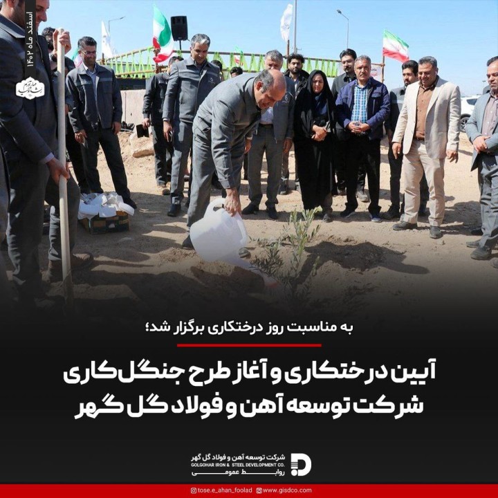در این مراسم که با حضور مهندس نجمی نیا مدیرعامل، معاونین، مدیران و کارکنان شرکت توسعه آهن و فولاد، رییس اداره محیط زیست سیرجان ، معاون اداره منابع طبیعی شهرستان همراه بود، طرح جنگل کاری و ارتقای فضای سبز مجموعه شرکت توسعه آهن و فولاد گل گهر در زمینی به مساحت 15 هکتار و کاشت 11 هزار درخت ، نیز آغاز شد.