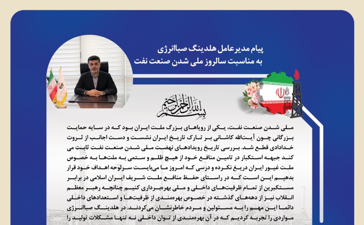 بررسی تاریخ رویدادهای نهضت ملی شدن صنعت نفت ثابت میکند جبهه استکبار در تامین منافع خود از هیچ ظلم و ستمی به ملتها به خصوص ملت غیور ایران دریغ نکرده و درسی که امروز ما میبایست سرلوحه اهداف خود قرار بدهیم این است که در راستای حفظ منافع ملت شریف ایران اسلامی در برابر مستکبرین از تمام ظرفیتهای داخلی و ملی بهرهبرداری کنیم چنانچه رهبر معظم انقلاب نیز از دهههای گذشته در خصوص بهرهمندی از ظرفیتها و استعدادهای داخلی دائما این مهم را به مسئولین و مردم خاطرنشان میکردند. در هلدینگ صباانرژی مواردی را تجربه کردیم که در آن بهرهمندی از توان داخلی نه تنها مشکلات تولید را مرتفع ساختند بلکه مانع خروج ارز و افزایش بهرهوری را در پیش داشتند که بومیسازی کلدباکس شرکت پتروشیمی جم یکی از آن موارد است. در واقع نهضت ملی شدن صنعت نفت در مسیر امروز خود در مبارزه با تحریمهای ظالمانه جهان استکبار باید به نهضت بومیسازی صنعت نفت ارتقا یابد. در این مسیر، افتخارات بینظیری به دست آمده که برخی از آن در مجموعه صباانرژی و در شرکتهای پتروشیمی جم، پتروشیمی جم پیلن، پتروشیمی مسجدسلیمان، لولهسازی اهواز، فولاد اکسین خوزستان در حوزه تولید گریدهای مختلف و ارائه خدمات منحصر به فرد در صنعت انتقال نفت رخ داده است. اینجانب ضمن تبریک روز ملی صنعت نفت به خانواده بزرگ صنعت نفت، گاز و پتروشیمی، از زحمات و تلاشهای مجاهدانه کارگران، مهندسان، کارمندان و مدیران این صنعت قدردانی میکنم و امیدوارم در سال آینده شاهد شکوفایی هرچه وسیعتر صنایع ملی میهن عزیزمان در قطع هرگونه وابستگی به بیگانگان باشیم.