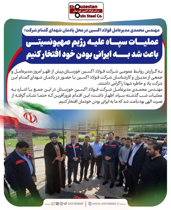 مهندس محمدی مدیرعامل شرکت فولاد اکسین خوزستان در این جمع با اشاره به عملیات شب گذشته سپاه، اظهار داشت: این اقدام غرورآفرین که حتما نشأت گرفته از نصرت الهی بود،باعث شد که ما به ایرانی بودن خودمان افتخار کنیم.