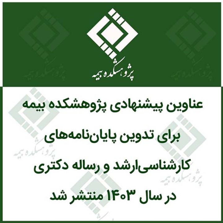 علاقهمندان جهت دریافت عناوین پایاننامههای کارشناسی ارشد و رساله های دکتری پیشنهادی پژوهشکده بیمه برای سال 1403 میتوانند به پیوست و یا بخش پژوهش تارنمای پژوهشکده بیمه به نشانی www.irc.ac.ir مراجعه فرمایند.