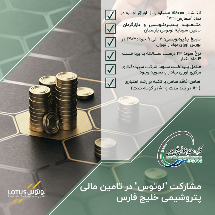 مبلغ 60 هزار میلیارد ریال اوراق اجاره شرکت صنایع پتروشیمی خلیج فارس با تعهد پذیره نویسی و بازارگردانی تامین سرمایه لوتوس پارسیان در بورس اوراق بهادار تهران عرضه می‌‌شود.