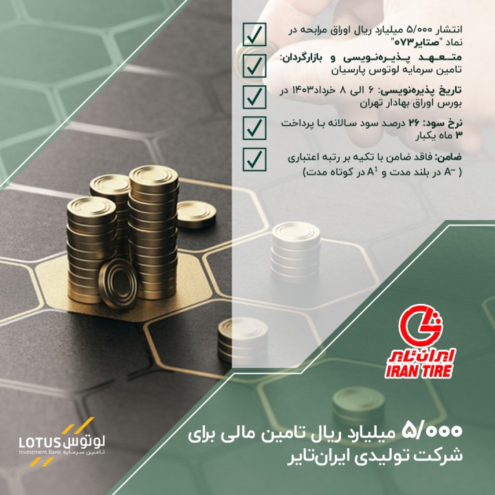 شرکت تولیدی ایران تایر، مبلغ 10 هزار میلیارد ریال اوراق مرابحه در بورس اوراق بهادار تهران منتشر می‌کند.