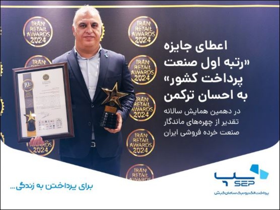 در دهمین همایش سالانه تقدیر از چهرههای ماندگار صنعت خردهفروشی، برترین برندها، فروشگاههای زنجیرهای و مراکز خرید ایران، «احسان ترکمن» بهعنوان مدیرعامل سپ، رتبه اول صنعت پرداخت را از آن خود کرد.