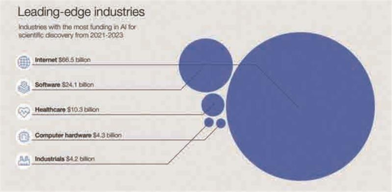 هوش مصنوعی (AI) اکتشافات علمی را از طریق هوش مصنوعی مولد (Generative AI) و مدلهای بنیادی (Foundation models) متحول کرده است. این پیشرفتها دانشمندان را قادر میسازد تا اکتشافاتی را که قبلاً غیرممکن بود انجام دهند و سرعت پیشرفت علمی را تسریع بخشند. نمونههای قابلتوجه عبارتاند از Deep Mind’s AlphaFold که میتواند ساختارهای سهبعدی پروتئینها را بهدقت پیشبینی، خانواده جدیدی از آنتیبیوتیکها را شناسایی و موادی را برای باتریهای کارآمدتر کشف کند. دانشمندان اکنون در حال ساختن و استفاده از مدلهای زبانی بزرگ (large language models) برای بررسی ادبیات علمی، طوفان فکری فرضیههای جدید با چتباتهای هوش مصنوعی (AI chatbots) و ایجاد مدلهای هوش مصنوعی برای تجزیهوتحلیل حجم وسیعی از دادهها هستند. این انقلاب مبتنی بر هوش مصنوعی نوید پیشرفتهای چشمگیری در تشخیص، درمان و پیشگیری از بیماریها، ایجاد مواد جدید برای فناوریهای سبز و پیشرفت در علوم زیستی میدهد. بااینحال، چالشهای اخلاقی از جمله خطرات حریم خصوصی، اختلالات اجتماعی مانند تغییر شیوه تعاملات اجتماعی و بازار کار و اثرات زیستمحیطی مانند استخراج چشمگیر منابع باید مورد توجه قرار گیرند. شکل شماره 1 نشاندهنده صنایعی است که بیشترین سرمایهگذاری را در AI برای اکتشافات علمی از سال 2021 تا 2023 انجام دادهاند.