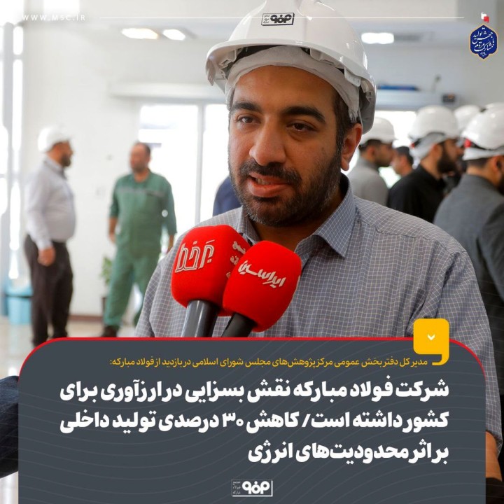 مدیر کل دفتر بخش عمومی مرکز پژوهشهای مجلس شورای اسلامی: شرکت فولاد مبارکه نقش بسزایی در ارزآوری برای کشور داشته است اما در مواقع بحران محدودیت انرژی، صنایع به عنوان اولین مجموعهها مشمول اعمال محدودیت میشوند به طوری که محدودیتهای انرژی در سال جاری منجر به کاهش ۳۰ درصدی تولید در کشور شده است.