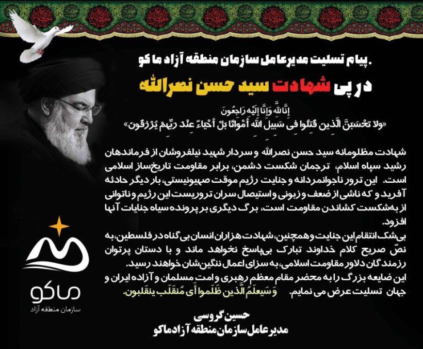 شهادت مظلومانه سید حسن نصرالله و سردار شهید نیلفروشان از فرماندهان رشید سپاه اسلام، ترجمان شکست دشمن، برابر مقاومت تاریخساز اسلامی است.