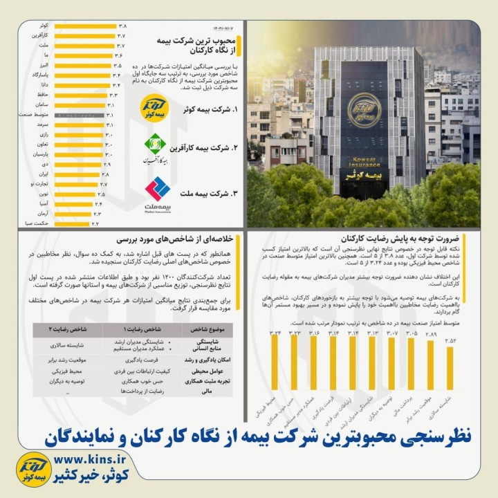این نظرسنجی که بر اساس 10 شاخص شایستهسالاری، موقعیت رشد برابر، شایستگی مدیران ارشد، پرداخت مالی، توصیه به دیگران، ارتباطات بین فردی، فرصت یادگیری، عملکرد مدیران، حس خوب همکاری و محیط فیزیکی در شرکتهای بیمه از کارمندان ستادی، کارمندان شعب و نمایندگان بیمه انجام شده است، نشان میدهد بیمه کوثر در جایگاه نخست محبوبترین شرکت بیمه قرار دارد.