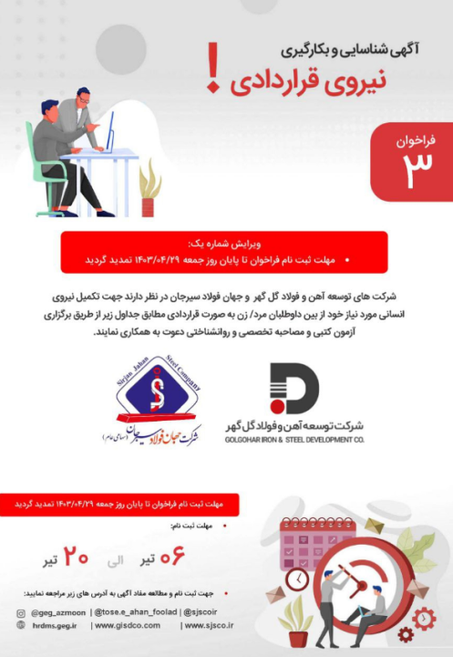 آگهي تمدید مهلت ثبت نام آزمون شناسايي و بکارگیری نیروی قراردادی شرکت توسعه آهن و فولاد گل گهر و شرکت جهان فولاد سیرجان