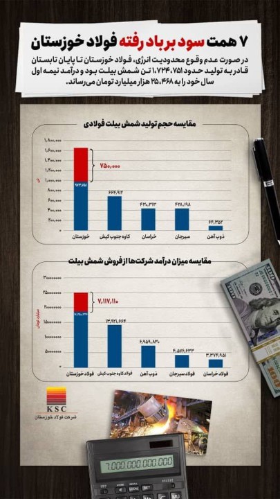 فولاد خوزستان در نیمه اول 1403 در صورت عدم اعمال محدودیت های برق قادر به تولید 1/724/751 تن شمش بیلت بود و درآمدش در نیمه اول سال به 25/468 هزار میلیارد تومان می رسید.