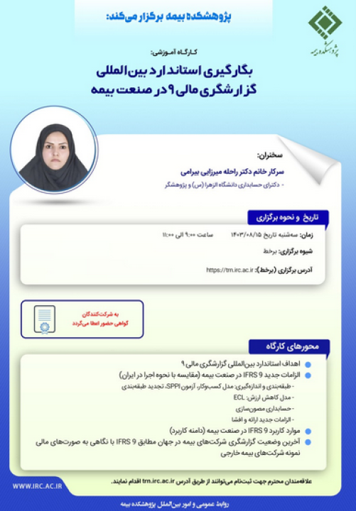 در این کارگاه آموزشی محورهای «اهداف استاندارد بین المللی گزارشگری مالی 9» ، «الزامات جدید 9 IFRS در صنعت بیمه (مقایسه با نحوه اجرا در ایران) شامل زیرمحورهای” طبقهبندی و اندازهگیری: مدل کسب و کار، آزمون SPPI، تجدید طبقه بندی” ، ” مدل کاهش ارزش: ECL” ، ” حسابداری مصون سازی” و ” الزامات جدید ارائه و افشا”»، «موارد کاربرد 9 IFRS در صنعت بیمه (دامنه کاربرد)» و «آخرین وضعیت گزارشگری شرکتهای بیمه در جهان مطابق 9 IFRS با نگاهی به صورتهای مالی نمونه شرکتهای بیمه خارجی» توسط خانم دکتر راحله میرزایی بیرامی دکترای حسابداری دانشگاه الزهرا (س) و پژوهشگر ارائه خواهد شد.