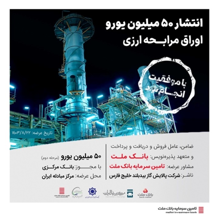 عرضه نخستین اوراق مرابحه ارزی کشور در سال 1403 با عاملیت بانک ملت و مشاوره تامین سرمایه بانک ملت در طرح بهسازی و احداث تاسیسات جمع آوری گازهای مشعل شرکت پالایش گاز بید بلند خلیج فارس به مبلغ 50 میلیون یورو با استقبال بی نظیر فعالان اقتصادی در روز 29 آبان ماه 1403 با موفقیت به پایان رسید