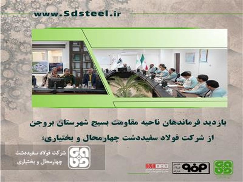 فرمانده ناحیه مقاومت بسیج شهرستان بروجن ضمن ابراز خرسندی از حضور در شرکت فولادسفیددشت، این  شرکت را یکی از پویاترین و سرزنده ترین صنایع استان برشمرد و اظهار داشت، علی رغم کارشکنی ها و تحریم های ظالمانه دشمنان قسم خورده نظام، شرکت فولاد سفیددشت با تلاش وهمت مدیران و کارکنان جهت تحقق منویات مقام معظم رهبری(مدظله العالی) و جهش تولید گام های بزرگی داشته است.