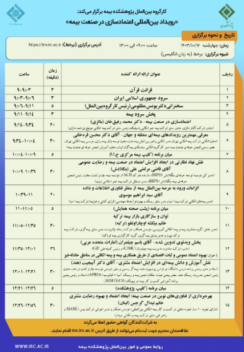 در رویداد بینالمللی اعتمادسازی در صنعت بیمه، محورهای «اعتمادسازی در صنعت بیمه» توسط دکتر محمد رفیق خان مشاور شرکت آلیانز مالزی، «معرفی مهمترین رویدادهای بیمهای منطقه و جهان» توسط دکتر محسن قره خانی معاون اتکایی شرکت بیمه اتکایی تهران، «نقش نهاد نظارتی در ایجاد افزایش اعتماد در صنعت بیمه و رضایت عمومی» توسط آقای قاضی مرتضی علی مدیر کل مؤسسه توسعه حرفهای بنگلادش، «الزامات ورود به عرصه بینالملل بیمه از منظر فناوری اطلاعات و داده» توسط آقای سید ابراهیم موسوی مدیر بیمههای اتکایی شرکت بیمه آسیا، «توان و سازگاری بازار بیمه ترکیه» توسط خانم منکشه اوچاراوغلو مدیر عامل گروه مشاوره بیمه و بیمه اتکائی آییوسی ترکیه، «بهبود اعتماد عمومی و ثبات اقتصادی از طریق همکاری بیمه و بیمه اتکائی در مناطق حادثهخیز» توسط آقای باسم چیلمران مدیر شرکت مشاوره مدیریت بیمه چیلمران امارات متحده عربی(آفلاین)، «نقش آموزش و دانش بیمهای در افزایش اعتماد مشتری» توسط دکتر آبیجیت استاد و مدیر رسمی برنامه درسی دانشگاه ایاماس یونسیون هند(آفلاین)، «بهرهبرداری از فناوریهای نوین در صنعت بیمه ایجاد اعتماد و بهبود رضایت مشتری» توسط خانم نیدال گرجس متخصص کسب و کار بیمه اتکائی بینالمللی لبنان(آفلاین)، به زبان انگلیسی ارائه خواهد شد.