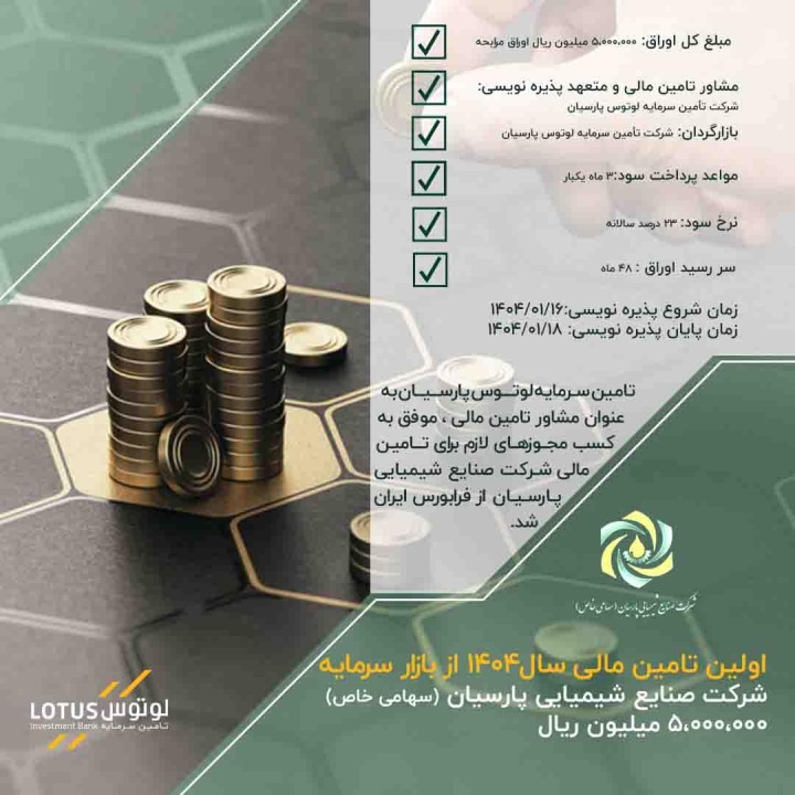 به گزارش روابط عمومی تأمین سرمایه لوتوس پارسیان، این شرکت موفق شد اولین تامین مالی بازار سرمایه کشور در سال 1404 را به مبلغ 5 هزار میلیارد ریال در فرابورس ایران برای شرکت صنایع شیمیایی پارسیان انجام دهد.