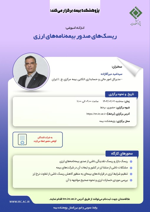 به گزارش روابط عمومی و امور بین‌الملل پژوهشکده بیمه، در این کارگاه آموزشی محورهای «ریسک بازار و ریسک نقدینگی ناشی از صدور بیمه‎ نامه‎ های ارزی»، « مشکلات ناشی از منشا ارز در کشور و تبعات آن در شرکت ‏های بیمه»، « تنظیم شرایط ارزی در قراردادهای بیمه‎ ای به منظور کاهش ریسک ناشی از تفاوت نرخ ارز» و «بررسی موردی خسارات ارزی و نحوه صحیح مواجهه با آن» توسط آقای سیدامید میرآقازاده ارائه خواهد شد.